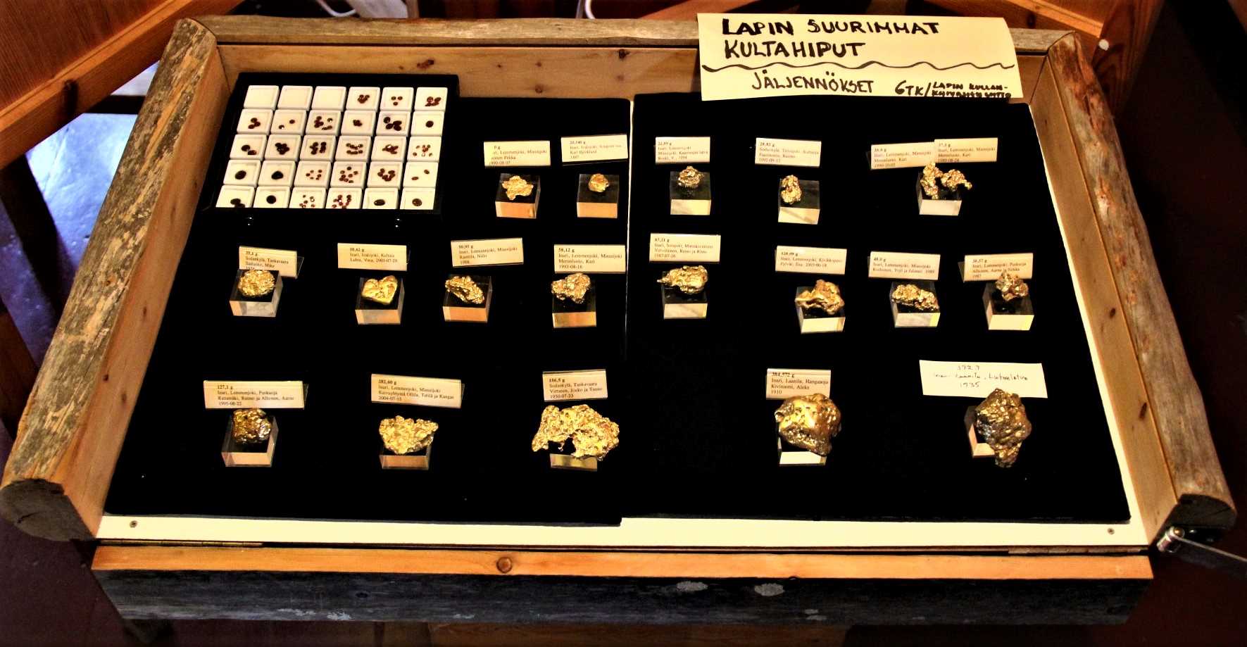 Suurten kultahippujen jäljennökset Kullankaivajain Liiton kokoelmassa.