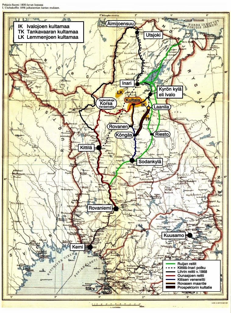 Vanhat kultareitit Published 1.8.2020 at 758 × 1024 in Vanhat kultareitit Lapin kultamaiden ja kultahistorian kartta. Kartan on laatinut kirjailija Erkki Lilja 1898 julkaistun Pohjois-Suomen kartan pohjalle.