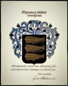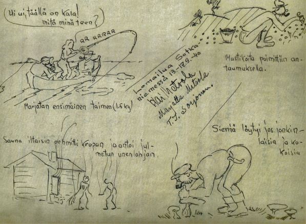 Wolter Stenbäckin lähimmät ystävät Marjatta ja Kai Metsola sekä Matkailijayhdistyksen kenttäsihteeri, Suomen Ladun perustaja ja ensimmäinen toiminnanjohtaja T.I. Sorjonen kirjasivat käyntinsä Sotkaniemen vieraskirjaan tällä piirroksella syyskuussa 1940..