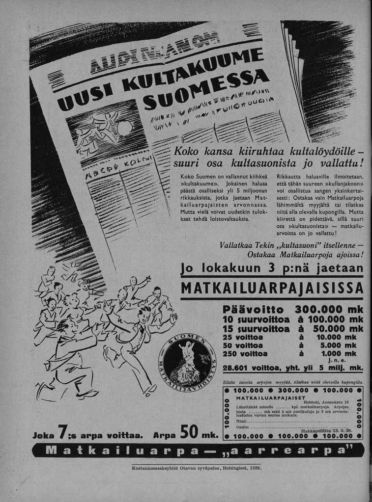 Alla mainos matkailuarpajaisista 1938. Tuotolla rahoitettiin matkailumajojen rakentamista Hangosta Petsamoon ja Kilpisjärvelle.