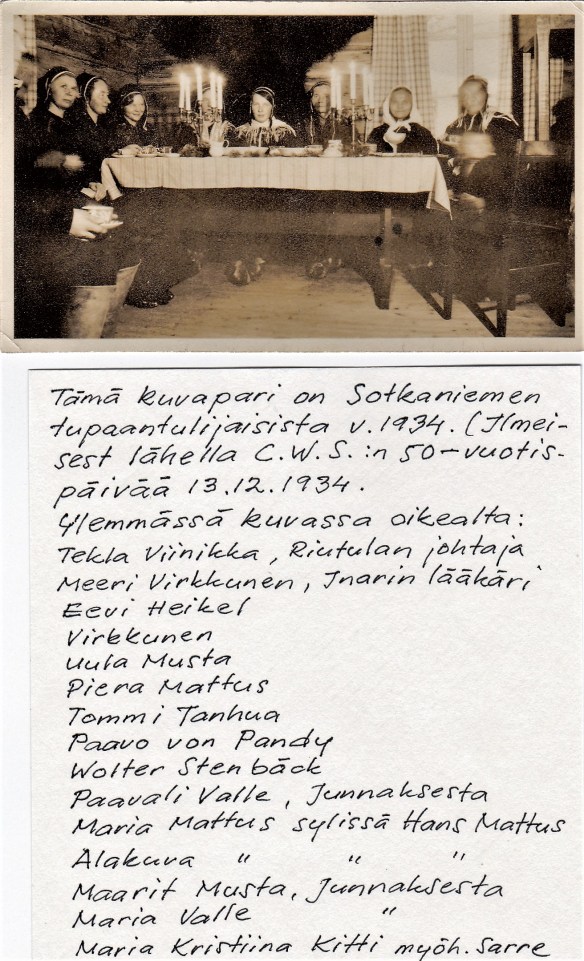 Sivu Wolter Stenbäckin Sotkaniemen vierakirjasta, jonka hän aloitti erämaatilan tupaantuliaisissa 1934. Kirja sisältää uskomattoman määrän tapahtumia ja vieraita niin lähiympäristöstä, Inarista, Petsamosta, Lapista, Suomesta ja ympäri maailmaa. Kirjan kopio on Kalle Metsolan hallussa Inarissa ja tämä juttu perustuu paljolti Kallen isän Pekka Metsolan kokoamaan aineistoon.